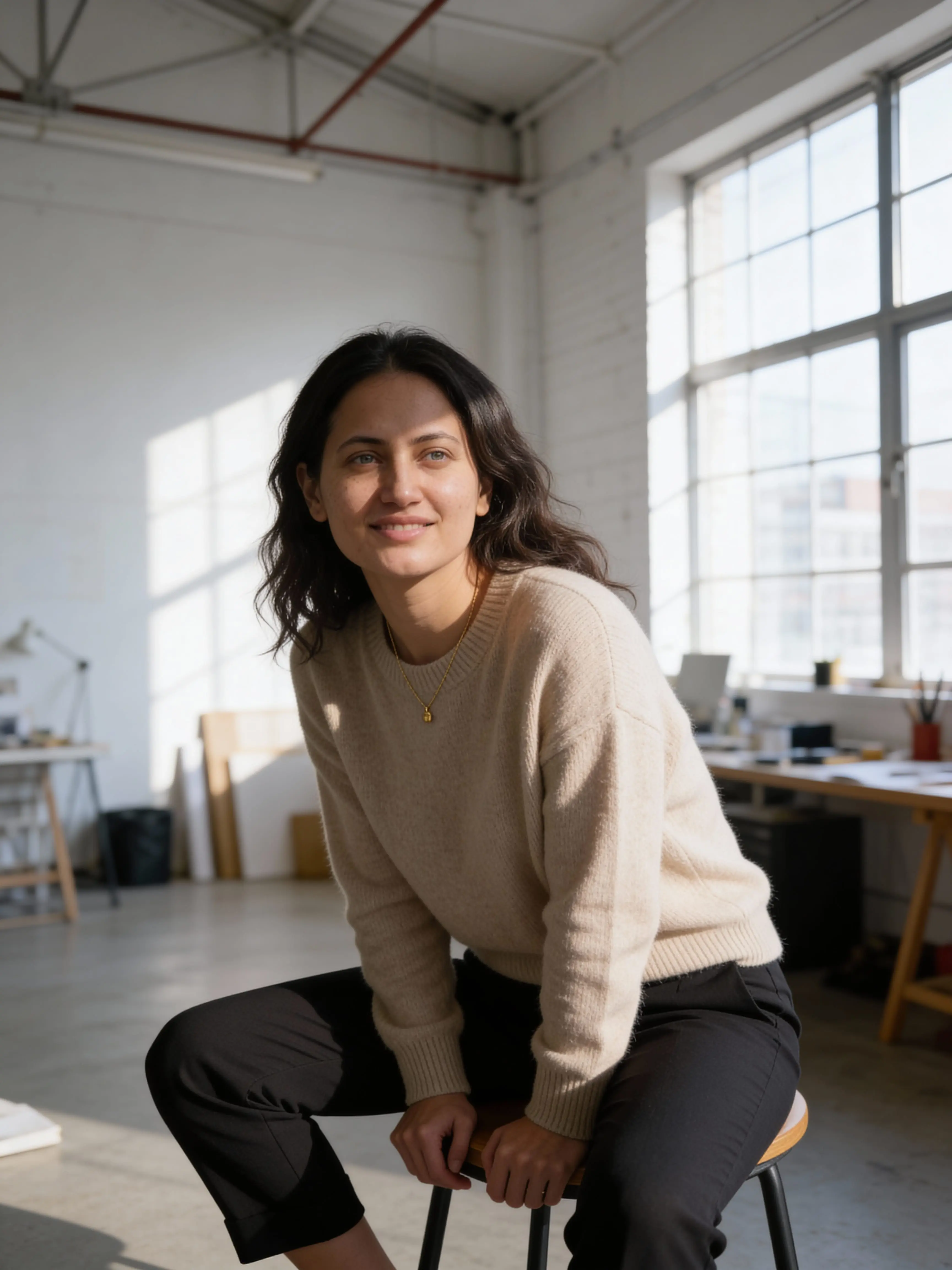 Laughing at a cafe, messy hair, waiting for subway.